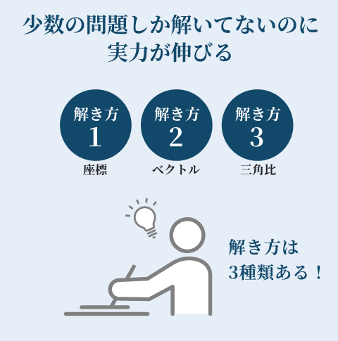 一般的に高校生は、数学の難問を複数の解法で解くところまで追求できる生徒はほとんどいません。しかし、数学の学習に必要なのは「量」ではなく「質」なのです。ただひたすらに大量の問題をこなすのではなく、一問の問題にじっくりと時間をかけ、様々な視点から問題を見る視点を養うことが、数学の実力を伸ばすための一番の近道なのです。難関大で出題されるような入試問題は一つしか解法がないことは少なく、ほとんどが複数の解法で解くことができる問題です。